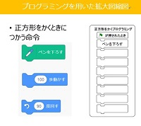 一覧へ 授業実施事例 カテゴリ 算数 対象 小学6年生 画像 概要 身近な生活の様々なものがプログラムで動いていることに気づき、単元導入前の取組として“Scratdh”を活用し、拡大図縮図のしくみや法則を考える 1) ねらい【教科観点より】縮図上の長さと実際の長さの関係性に気づくことができる。【プログラミング教育観点より】プログラムは我々の生活の身近なところにあるものだということ、またプログラミングにはその指示を的確に出せる知識が伴なうことが理解できる。 2) 新学習指導要領上の位置付け算数科 [第6学年] 資料 ダウンロード