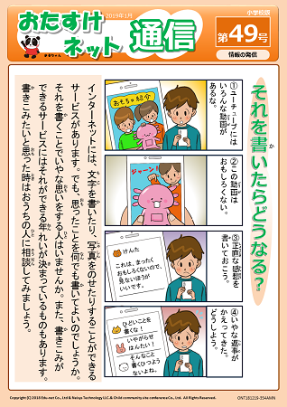 情報モラルに関する継続的な指導に役立つ通信です。毎月「お助けネット通信(全学年の学級向け/教職員向け)」を、また年に2回「お助けネットポスター」をお送りします。通信の内容について朝や帰りの5分で話をしたり、各教室に掲示、学校だより・学級だよりにもご利用いただけます。