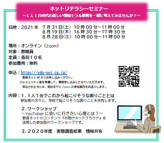 2021年7月13日:株式会社教育ネット(神奈川県横浜市都筑区 代表:大笹いづみ)は、情報モラル教育のクラウドサービス『お助けネットクラウド』を活用した「ネットリテラシーセミナー」を2021年7月31日(土)、8月19日(木)、8月28日(土)にオンラインで開催予定。同セミナーは今年度から5回開催し、好評の声をいただいた。 『お助けネットクラウド』は2020年EdTech補助金により、1人1台環境での実証を目的に、既に57校(小学校41校、中学校16校)に導入実績を持つクラウドサービス。 同セミナーではGIGAスクール構想により1人1台のICT機器の導入によって想定されるトラブルや困りごとを参加者同士が共有し、『お助けネットクラウド』を実際に活用した参加型ワークショップを用意。また、GoogleスライドやJamboardなどのツールを利用する予定。1人1台だからこそ必要とされる「体験で学び合う」情報モラルの授業を先生自身が体験できる内容となっている。