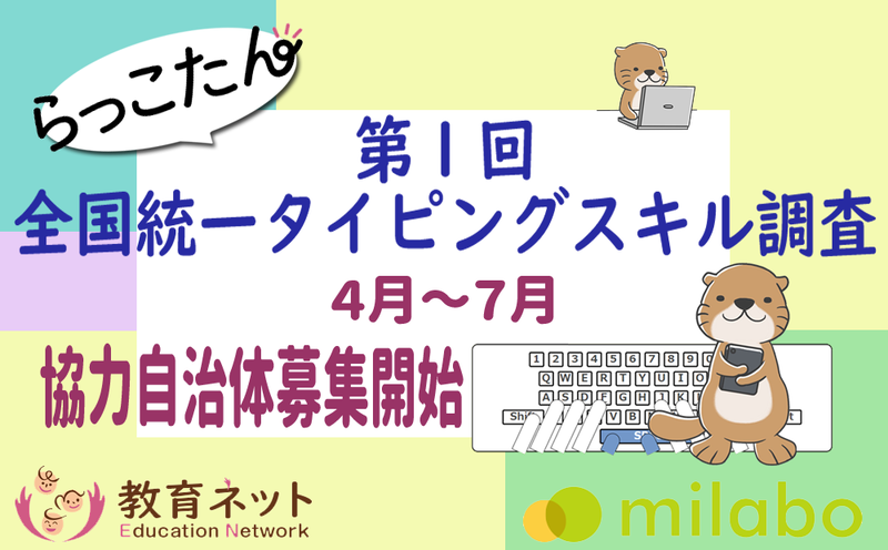 2022年3月23日:株式会社教育ネット(神奈川県横浜市都筑区 代表:大笹いづみ)と株式会社ミラボ(東京都千代田区 代表: 谷川一也)は、共同開発したクラウド型デジタルAI教材『らっこたん』を使用した『第1回全国統一タイピングスキル調査』の実施を決定した。2022年4月~7月の期間で任意の1週間で調査に参加可能。この度、調査に協力可能な自治体を募集開始する。