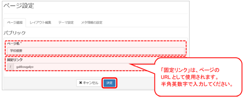 - [ページ名]と[固定リンク]を入力し、[決定]ボタンをクリックします。[固定リンク]はそのままURLに付加されるので半角英数で入力してください。