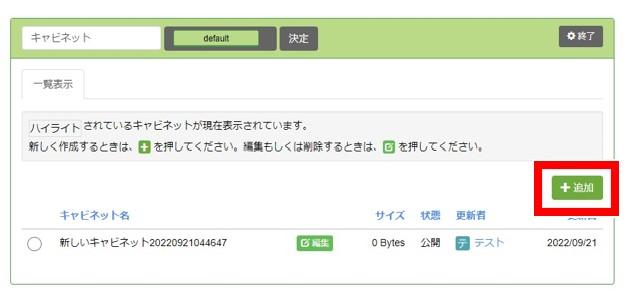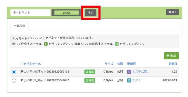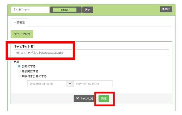 - [キャビネット名]の欄に任意の名前を入れて、[決定]を押してください。