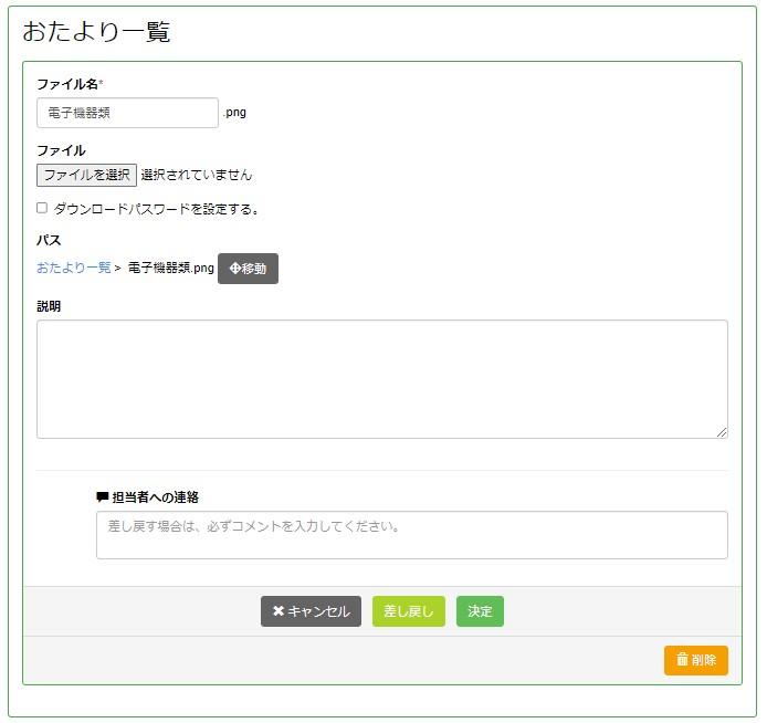- 承認する場合は[決定]ボタンを押してください。差し戻しをする場合は、差戻理由を[担当者への連絡]の枠に記載してください。