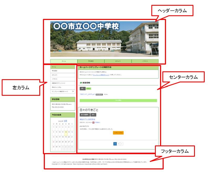 カラムとは、サイトの領域のことです。お助けホームページでは、サイトの上の部分を「ヘッダーカラム」、左側を「左カラム」、中心を「センターカラム」、サイトの底にあたる部分を「フッターカラム」と名付けています。