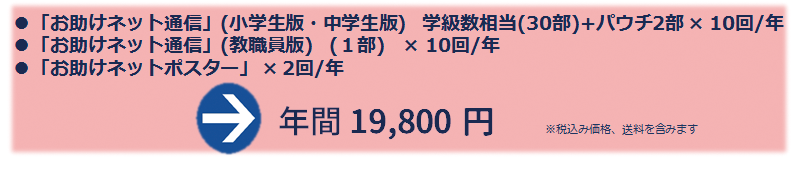 情報モラルに関する継続的な指導に役立つ通信です。毎月「お助けネット通信(全学年の学級向け/教職員向け)」を、また年に2回「お助けネットポスター」をお送りします。通信の内容について朝や帰りの5分で話をしたり、各教室に掲示、学校だより・学級だよりにもご利用いただけます。